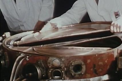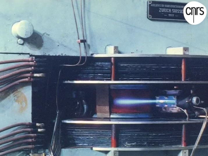 Ce cyclotron était clos, (par une mince feuille d’or), et le faisceau sortait dans l’air, ce qui permettait d’ailleurs de le visualiser par la lumière qu’il produisait.
