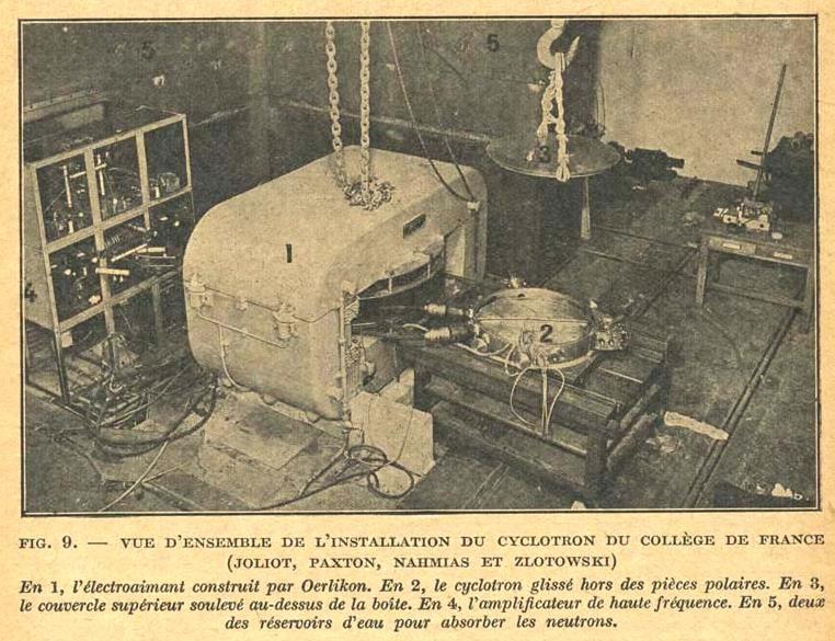 Extrait d’un article de « la science et la vie », n° 240, 1939, de M-E.Nahmias « le cyclotron, la désintégration de la matiere et la radiobiologie » (http://www.histcnrs.fr/fac-simile/cyclotron-joliot/cyclotron-joliot.html).